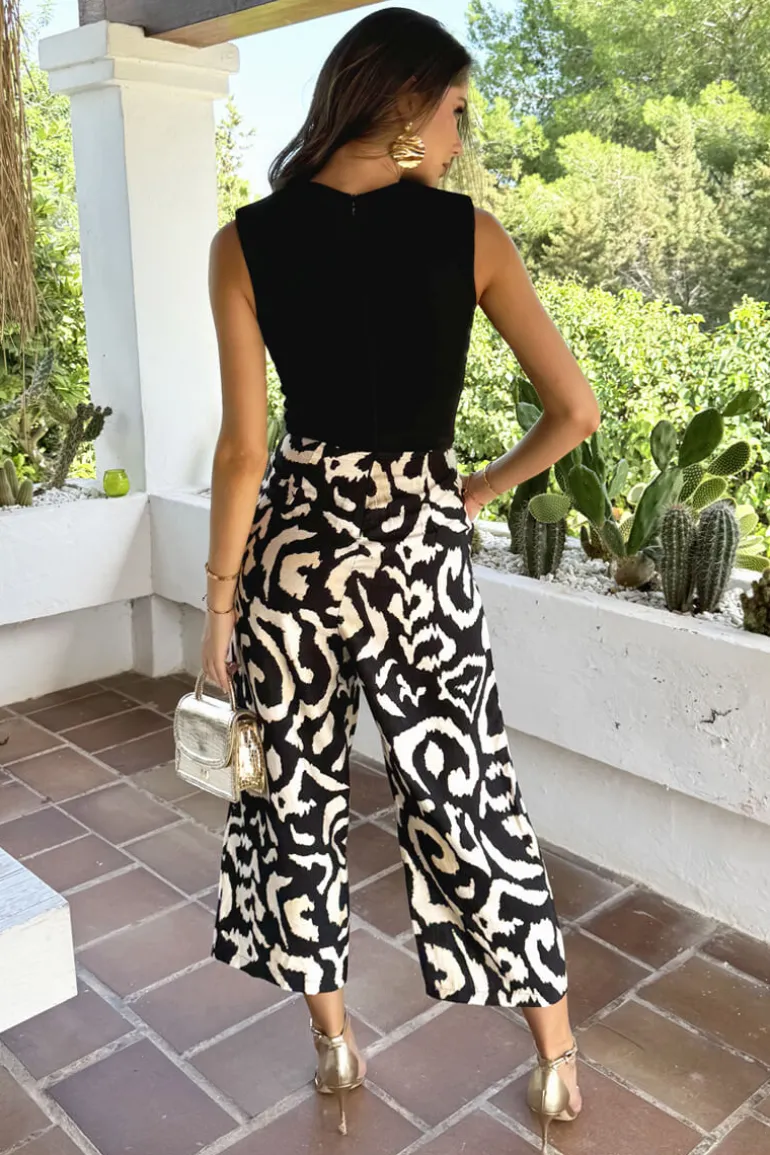 Print 2 In 1 Culotte Jumpsuit. Featuring a black top with a round