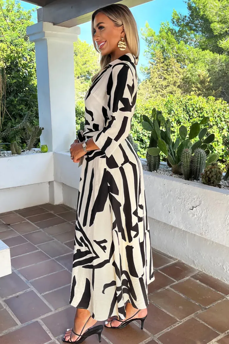 collar with V shaped neckline, a tie waist, 3/4 lenght sleeves and a