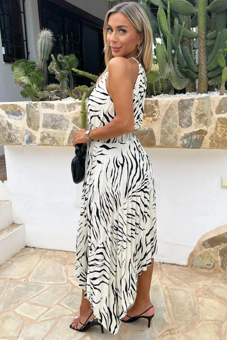 Our Black And Cream Zebra Print Zig Zag Hem Pleated Midi Dress is the