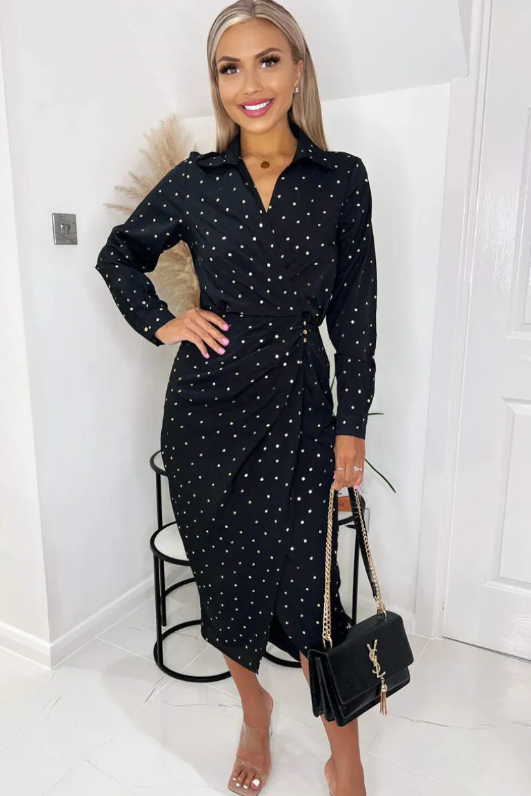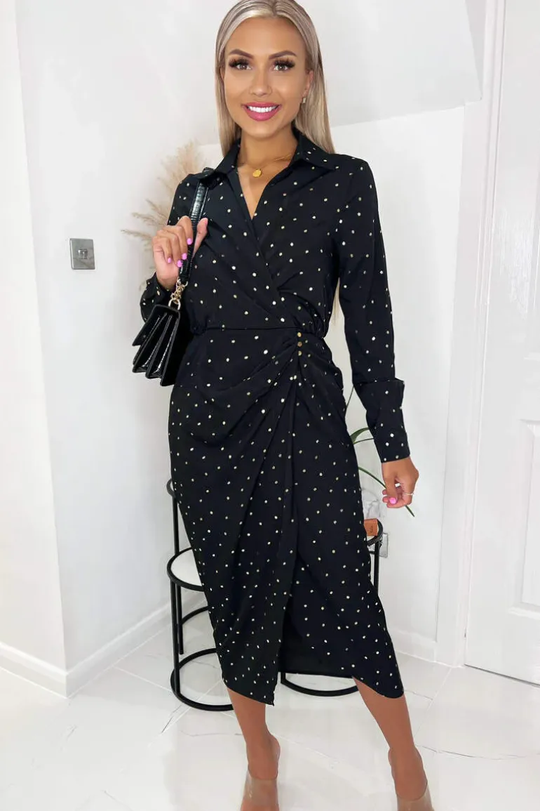Shop our Black And Gold Polka Dot Gathered Midi Dress featuring a