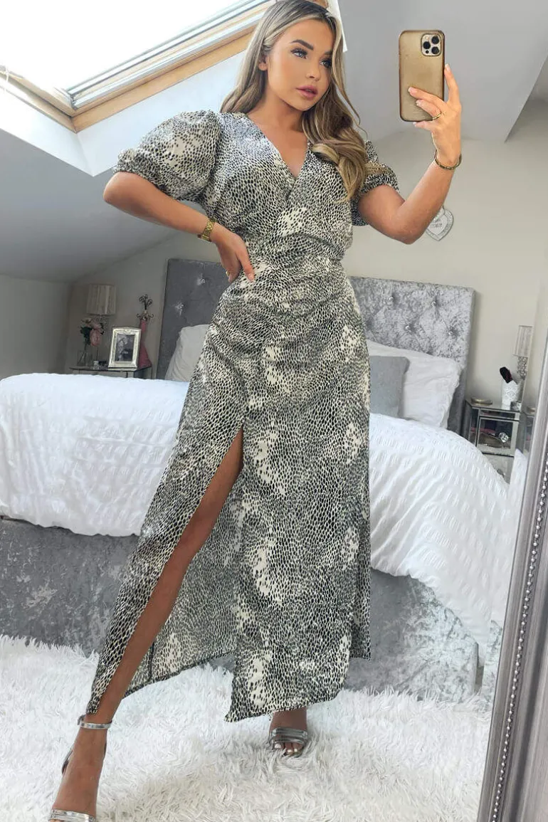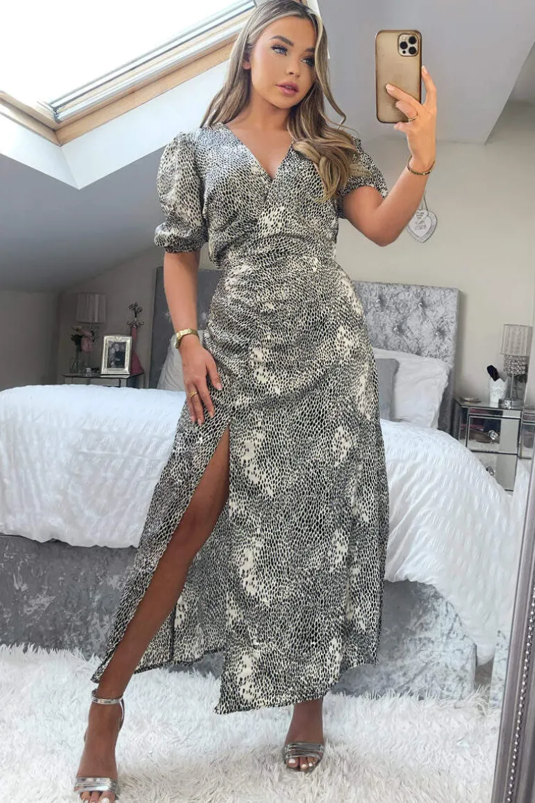 Stay on trend with this Black And Stone Printed Ruched Side Midi