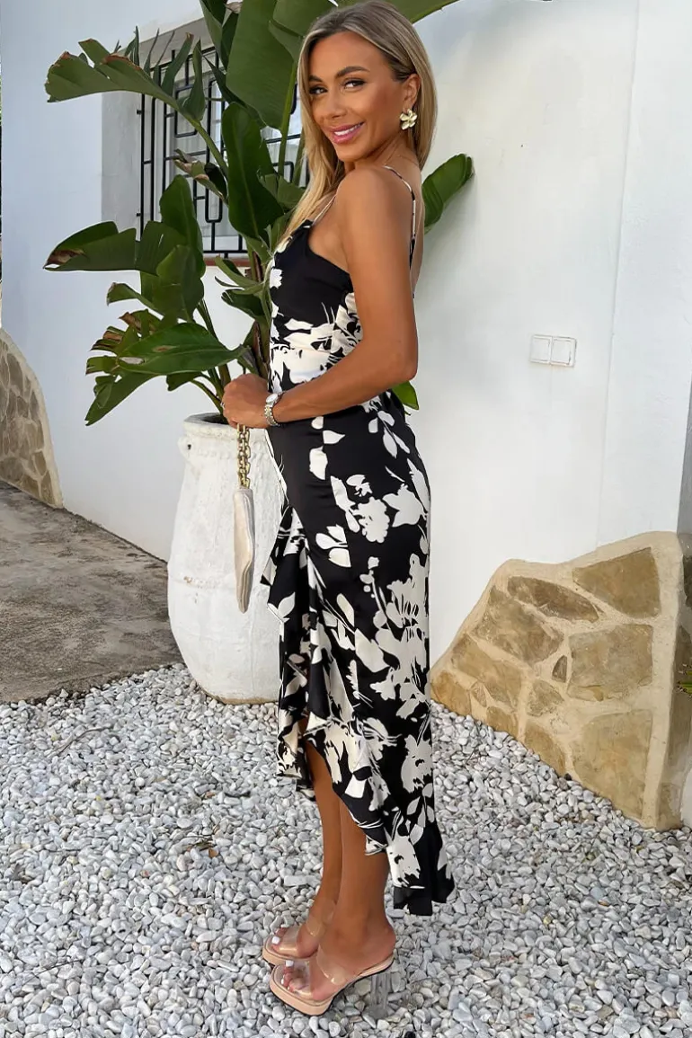 Our Black And White Floral Print Strappy High Low Frill Hem Midi Dress