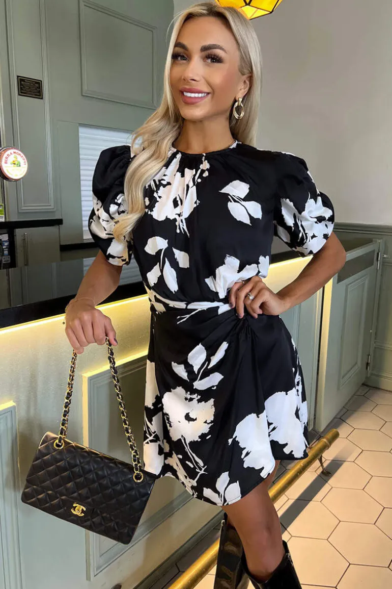 Sleeve Gathered Side Mini Dress. Featuring puff sleeves, a round
