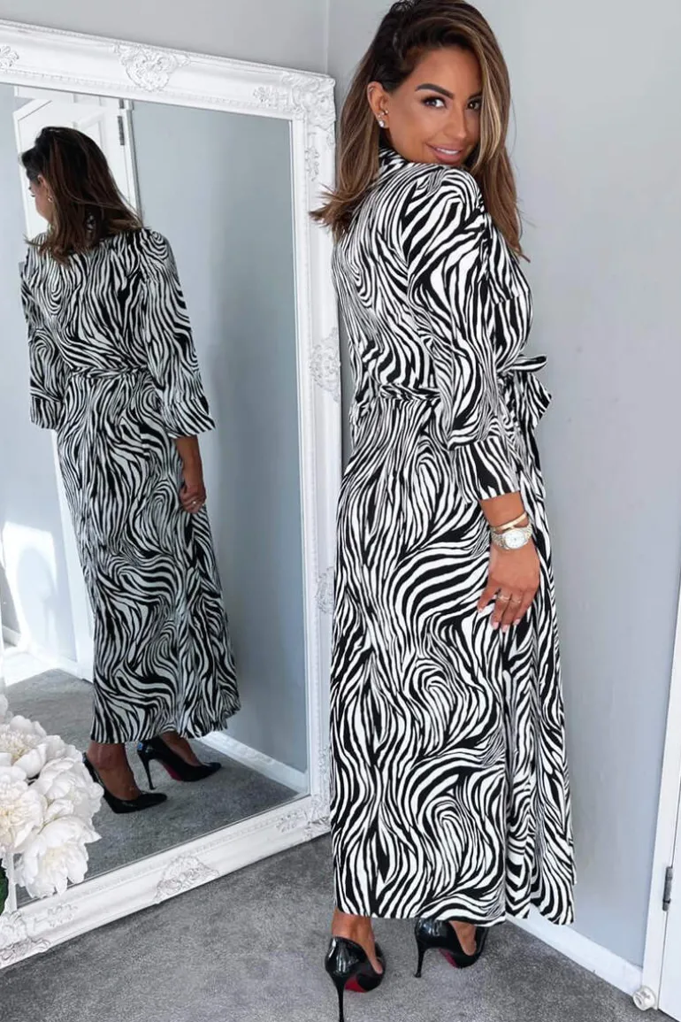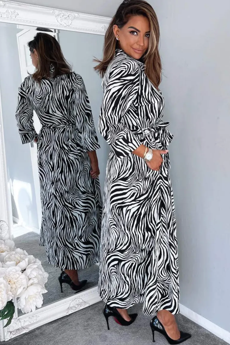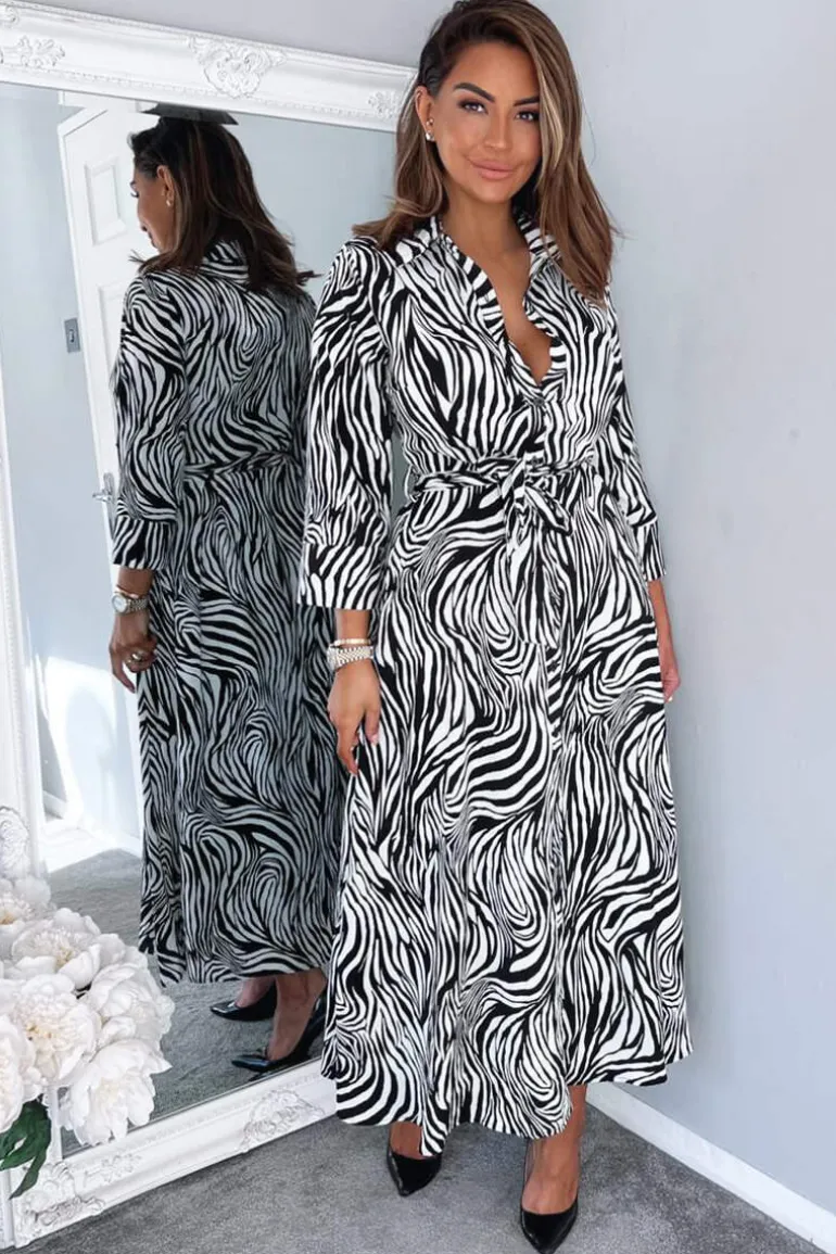 Stay on trend in our Black And White Zebra Print Midi Shirt Dress.