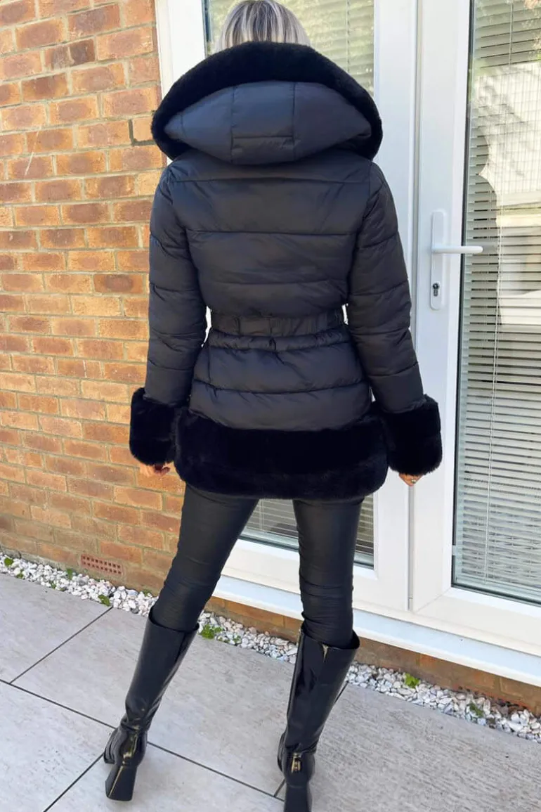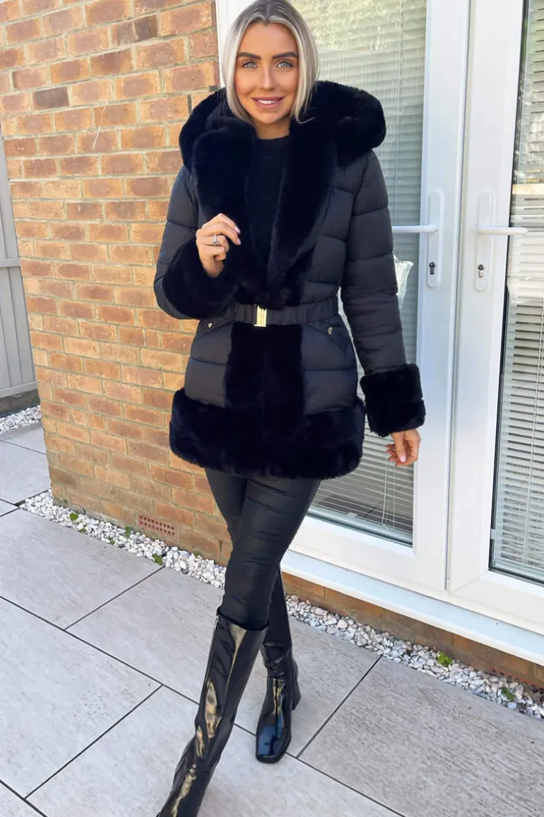 Get your winter wardrobe ready with our Black Faux Fur Trim Belted
