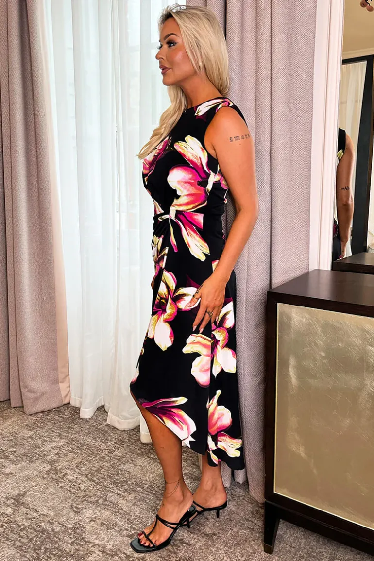 Our Black Floral Print Gathered Midi Dress With Shoulder Pads is the