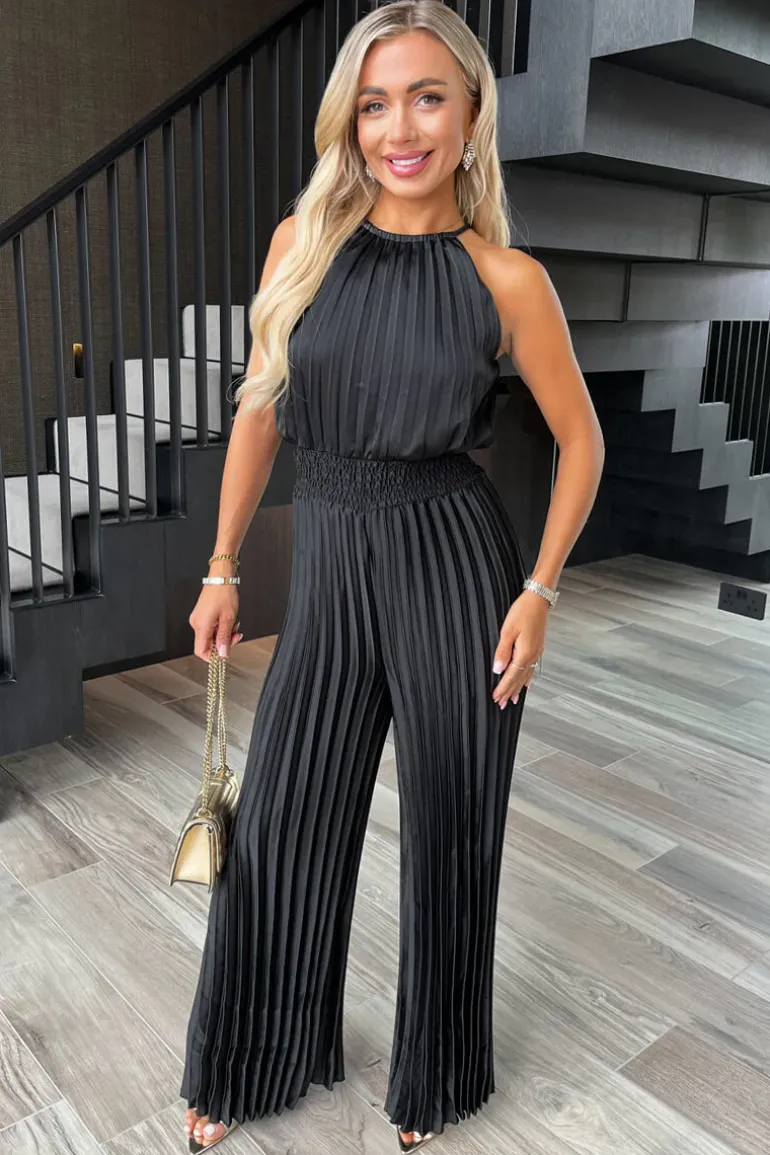 Neck Shirred Waist Pleated Jumpsuit. Designed in a black pleated