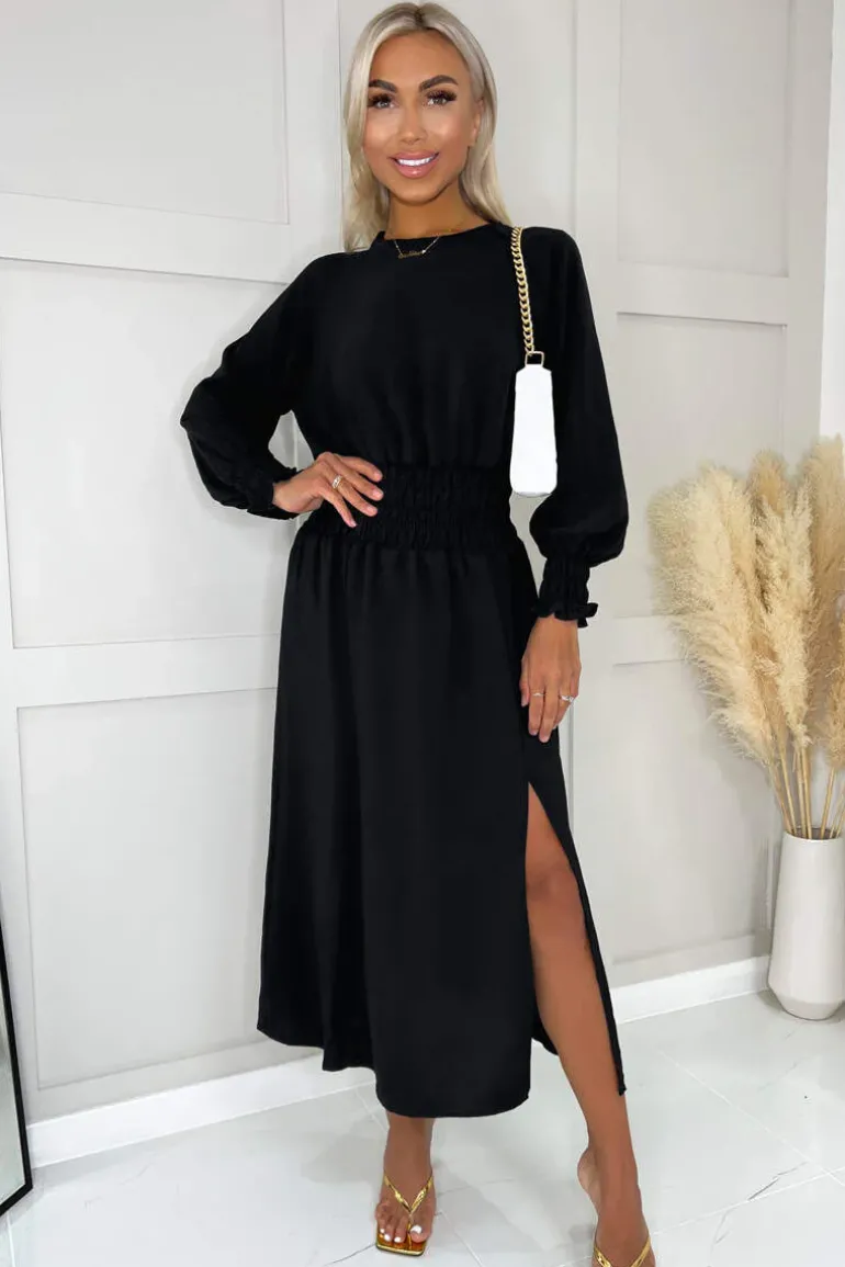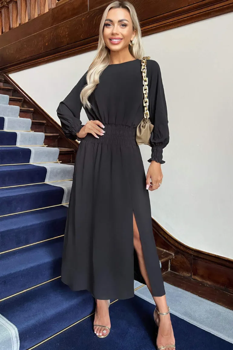 This Black Long Sleeve Shirred Detail Midi Dress is perfect for any