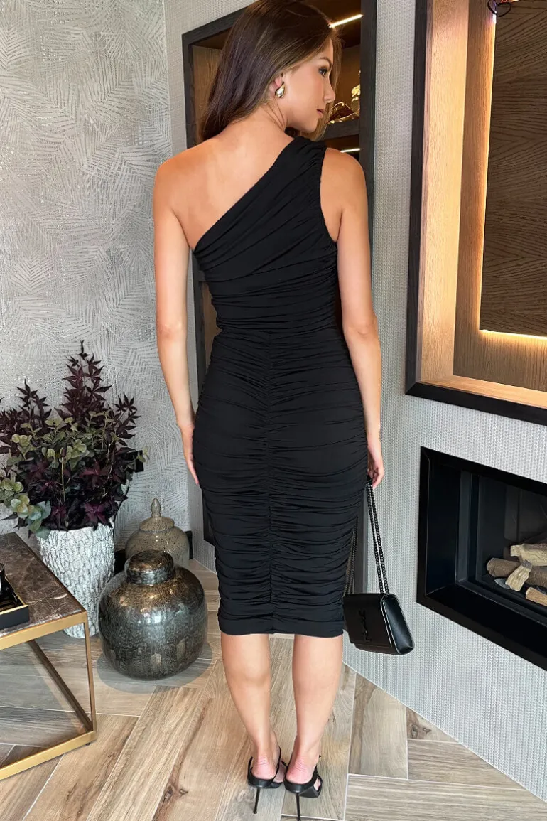 Our Black One Shoulder Bodycon Ruched Midi Dress is perfect for