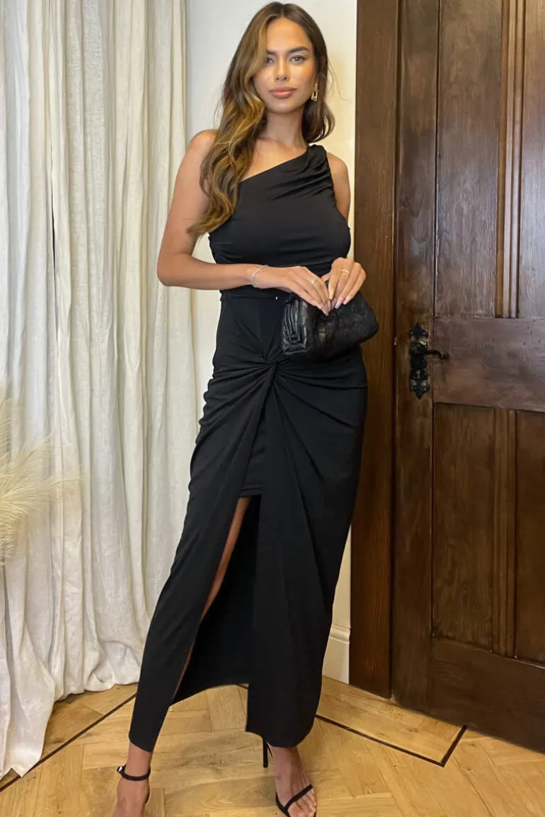 One Shoulder Knot Skirt Midi Dress. Featuring a statement one shoulder