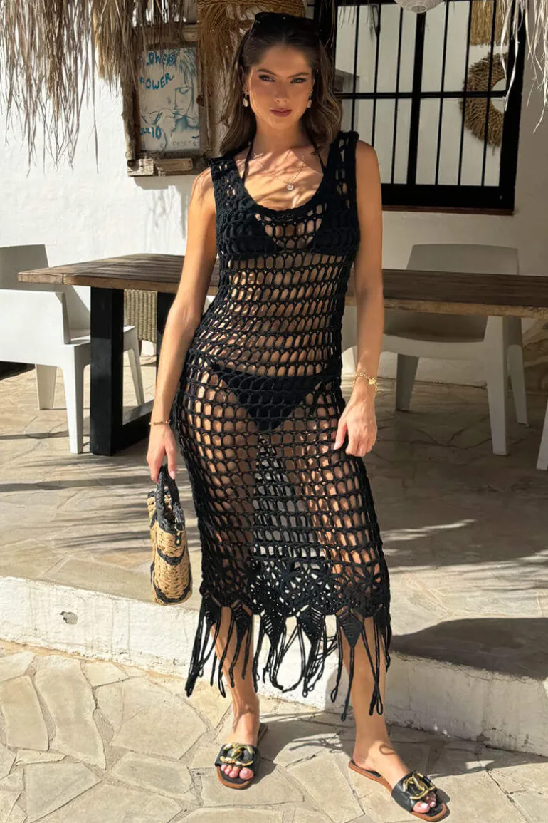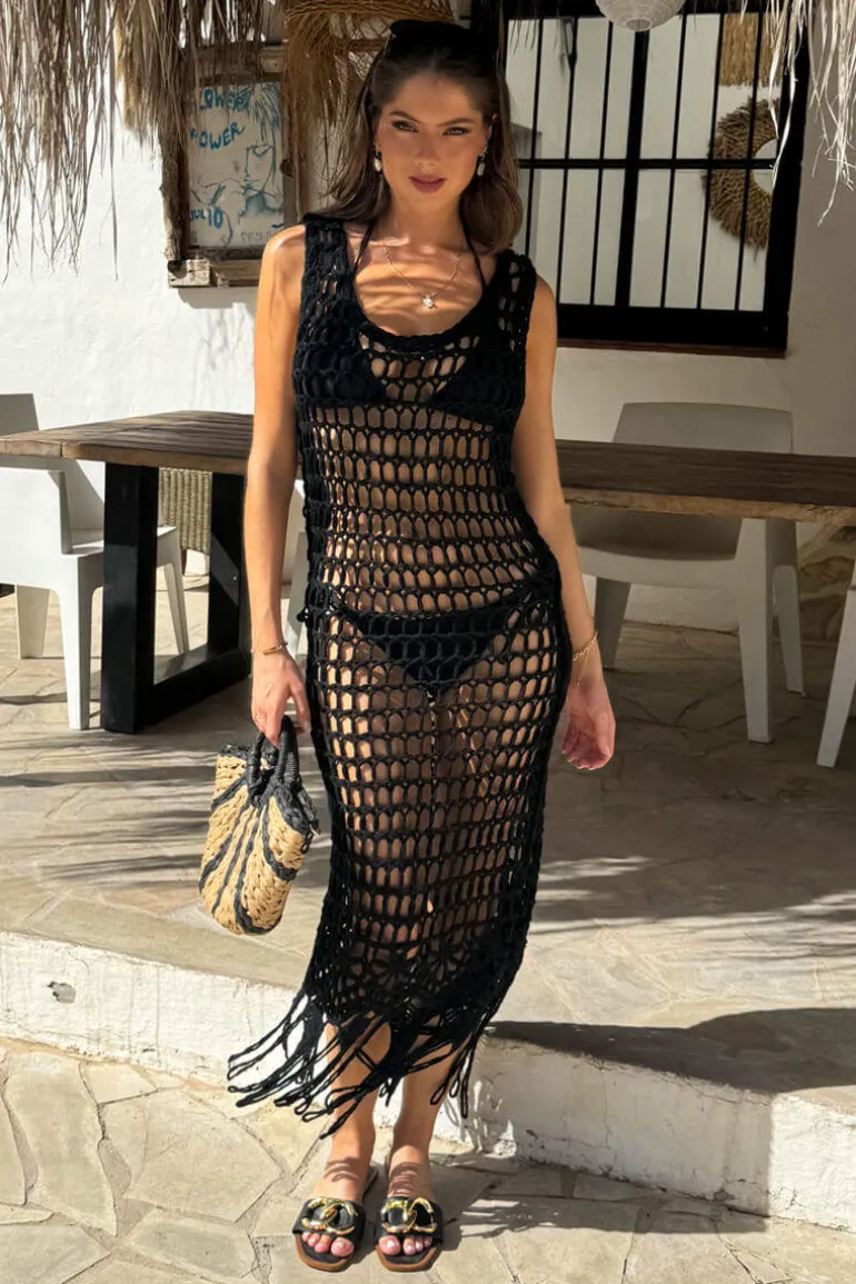 Our Black Open Stitch Crochet Tassel Midi Dress is an essential