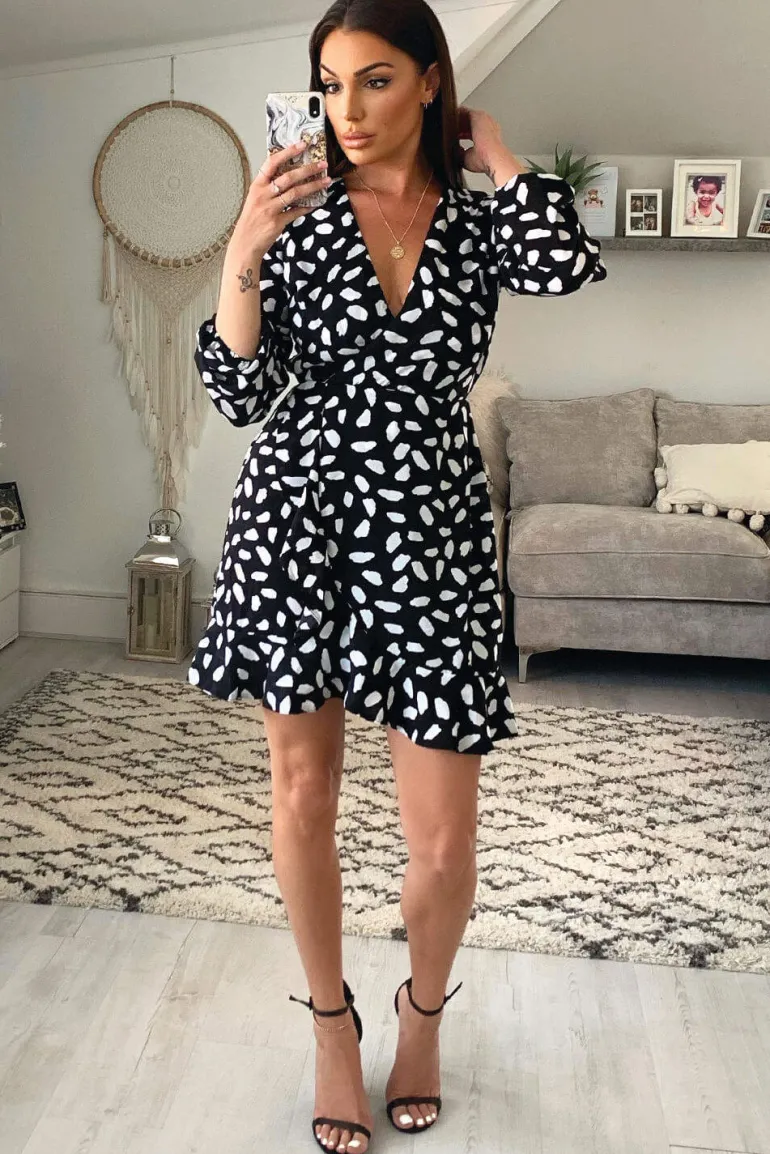 to night. Featuring a wrap top, ruffle hem skirt and back zip