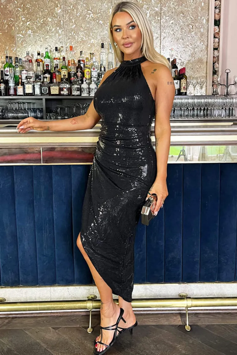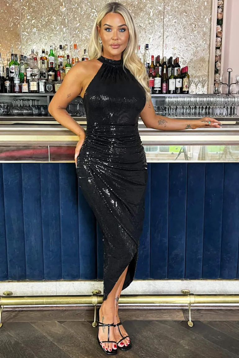 Feel like a goddess in our Black Halter Neck Draped Wrap Skirt Midi
