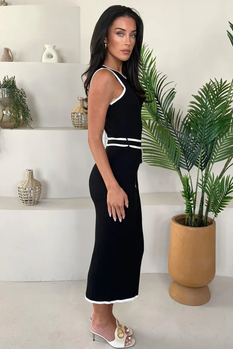 Be right on trend in our Black Ribbed Contrast Detail Knitted Dress!