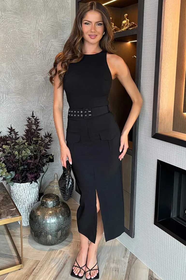 Our Black Round Neck Belted Bodycon Cargo Midi Dress is your next