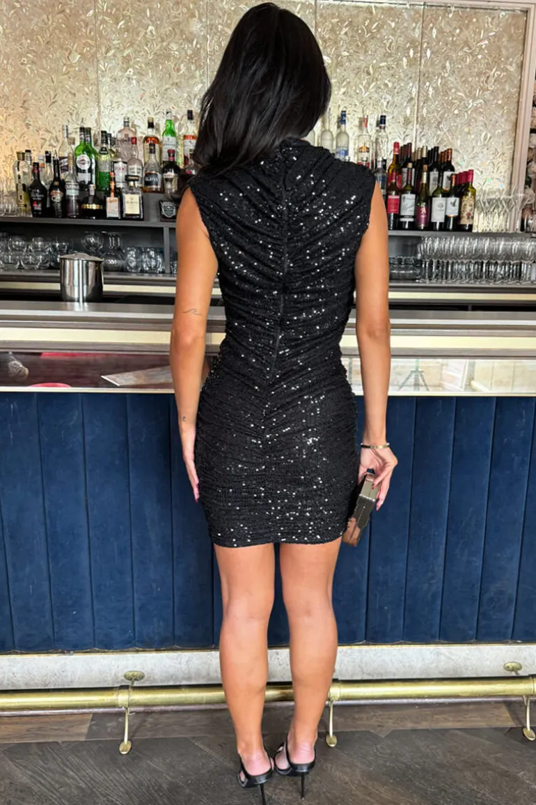 Get ready to steal the spotlight in our Black Sequin High Neck Ruched