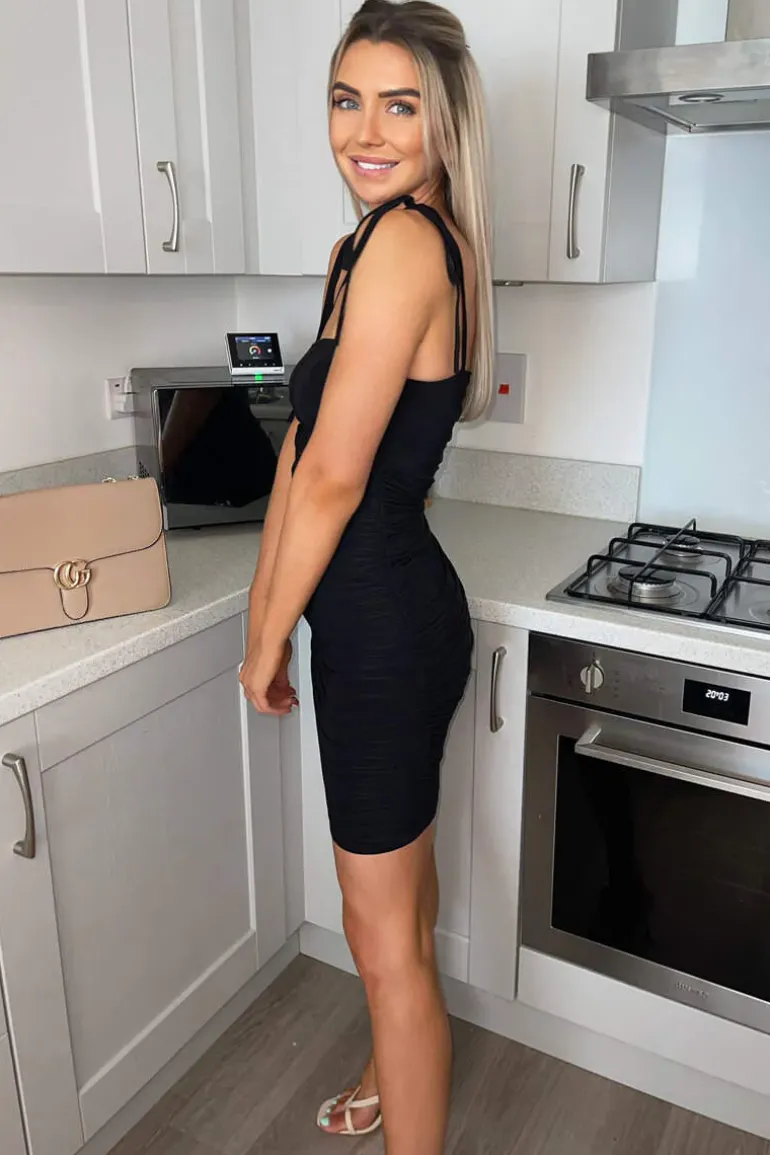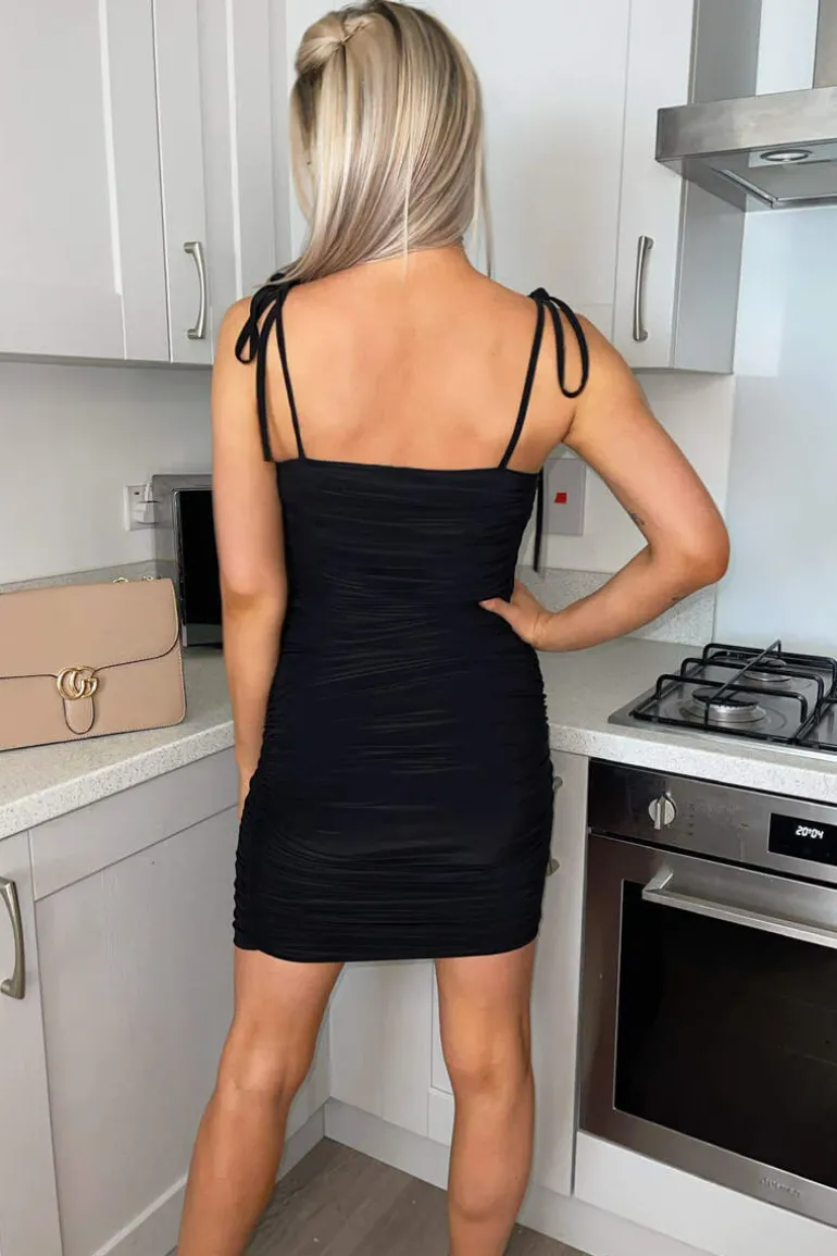 Our Black Slinky Tie Strap Ruched Bodycon Dress is a wardrobe must