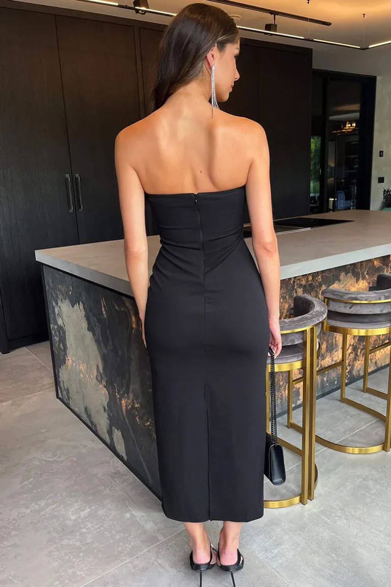 Stand out from the crown in our Black Strapless Feather Detail Midi