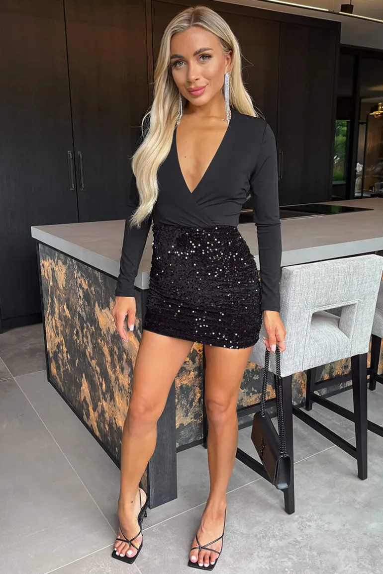 Our Black Velvet Sequin 2 in 1 Wrap Top Long Sleeve Mini Dress adds a