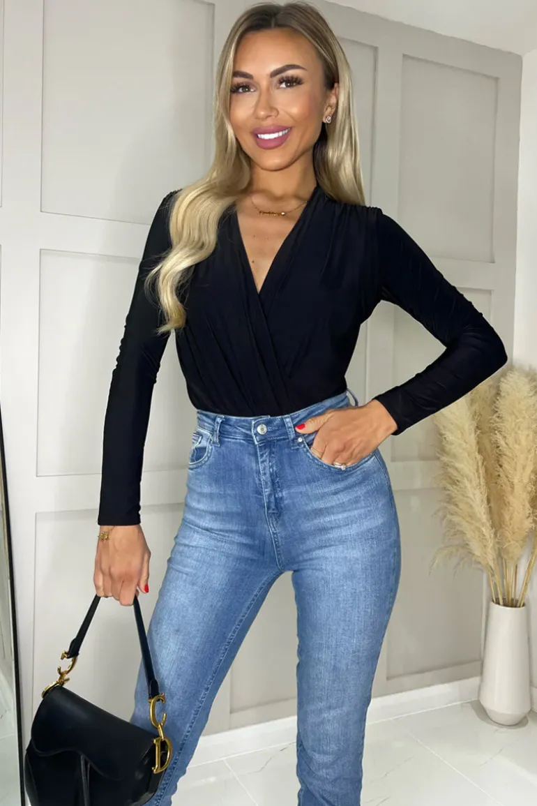 Add style to any outfit with our Black Wrap Top Long Sleeve Slinky
