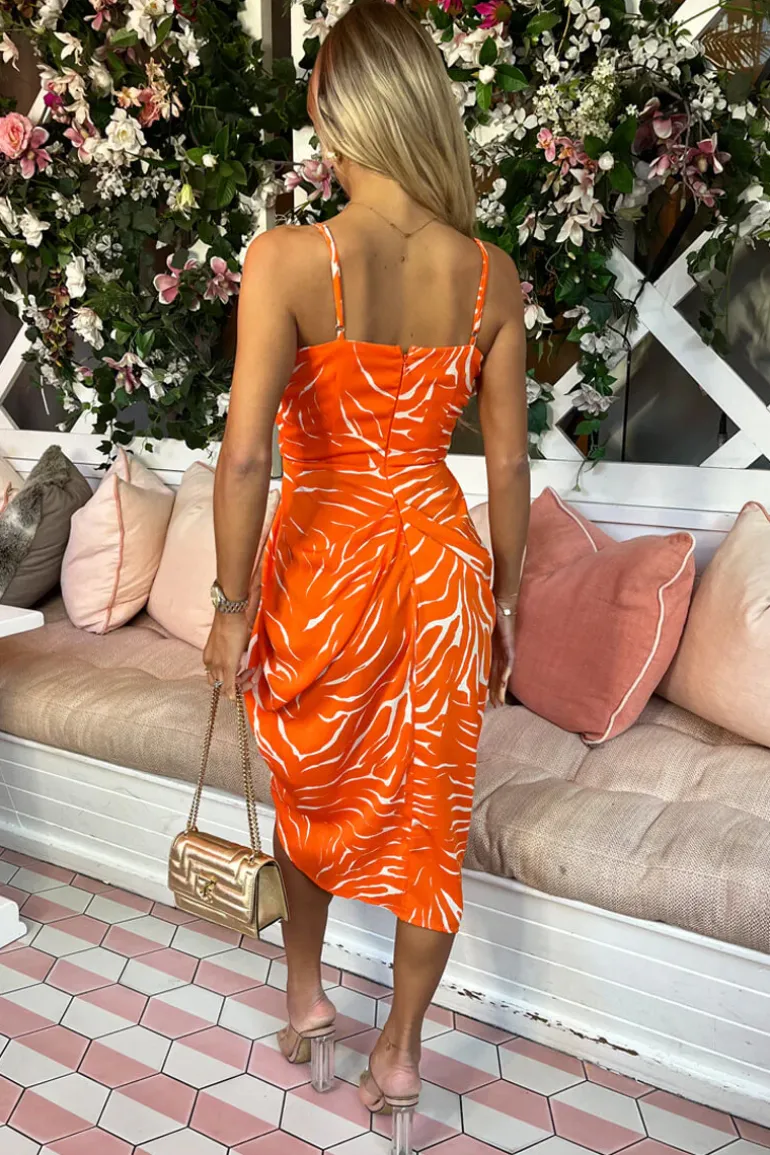 This Blood Orange Printed Strappy Midi Dress is a must have this