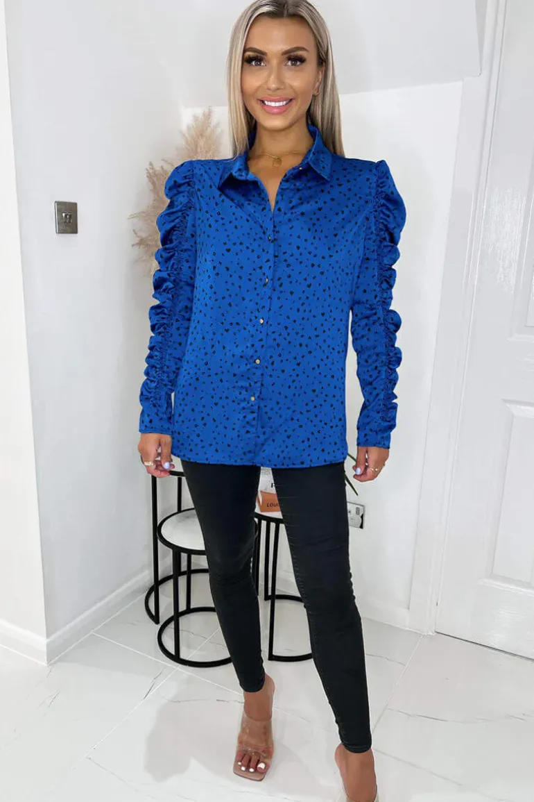 This Blue And Black Printed Long Ruched Sleeve Shirt would be a great