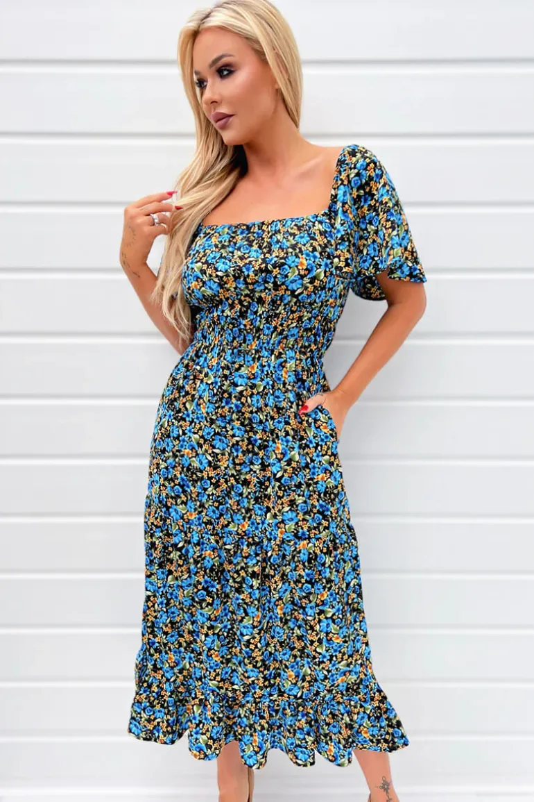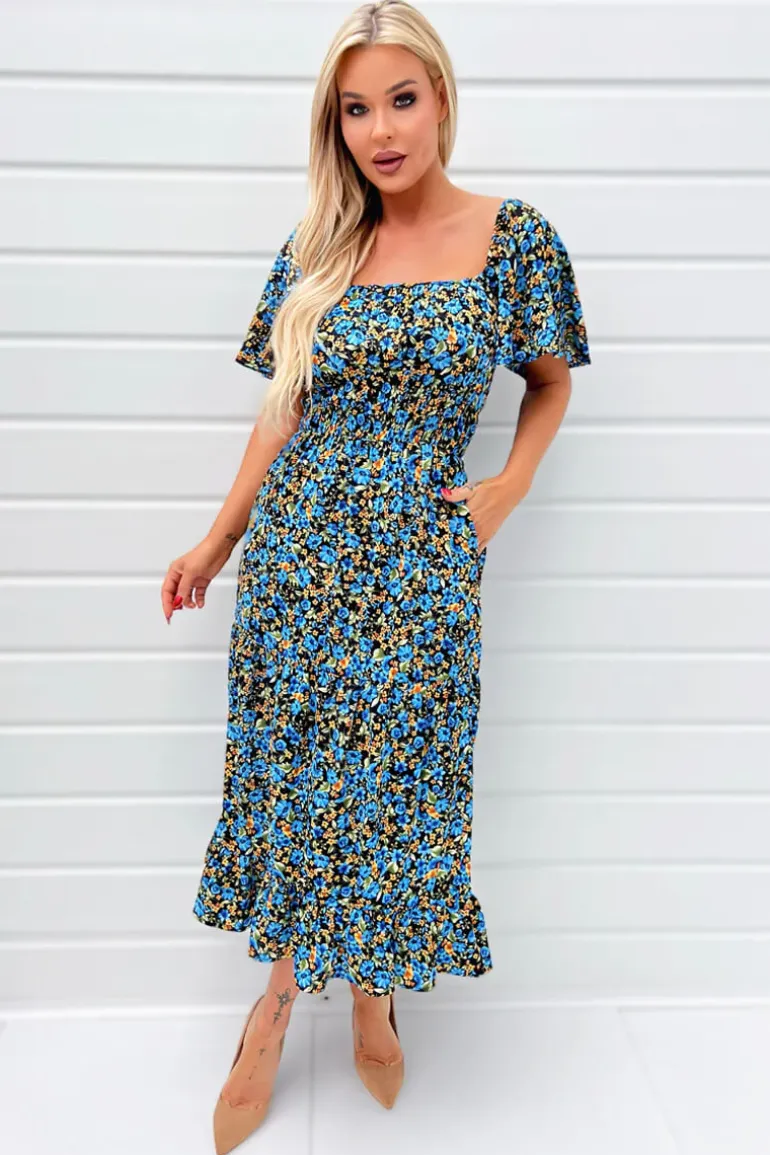 This Blue Multi Floral Printed Flutter Sleeve Midi Smock Dress is a