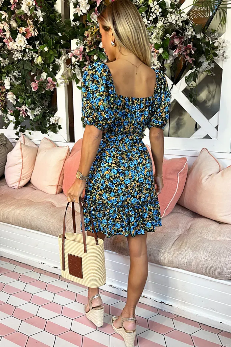 Our Blue Floral Printed Puff Sleeve Frill Hem Mini Dress is right on