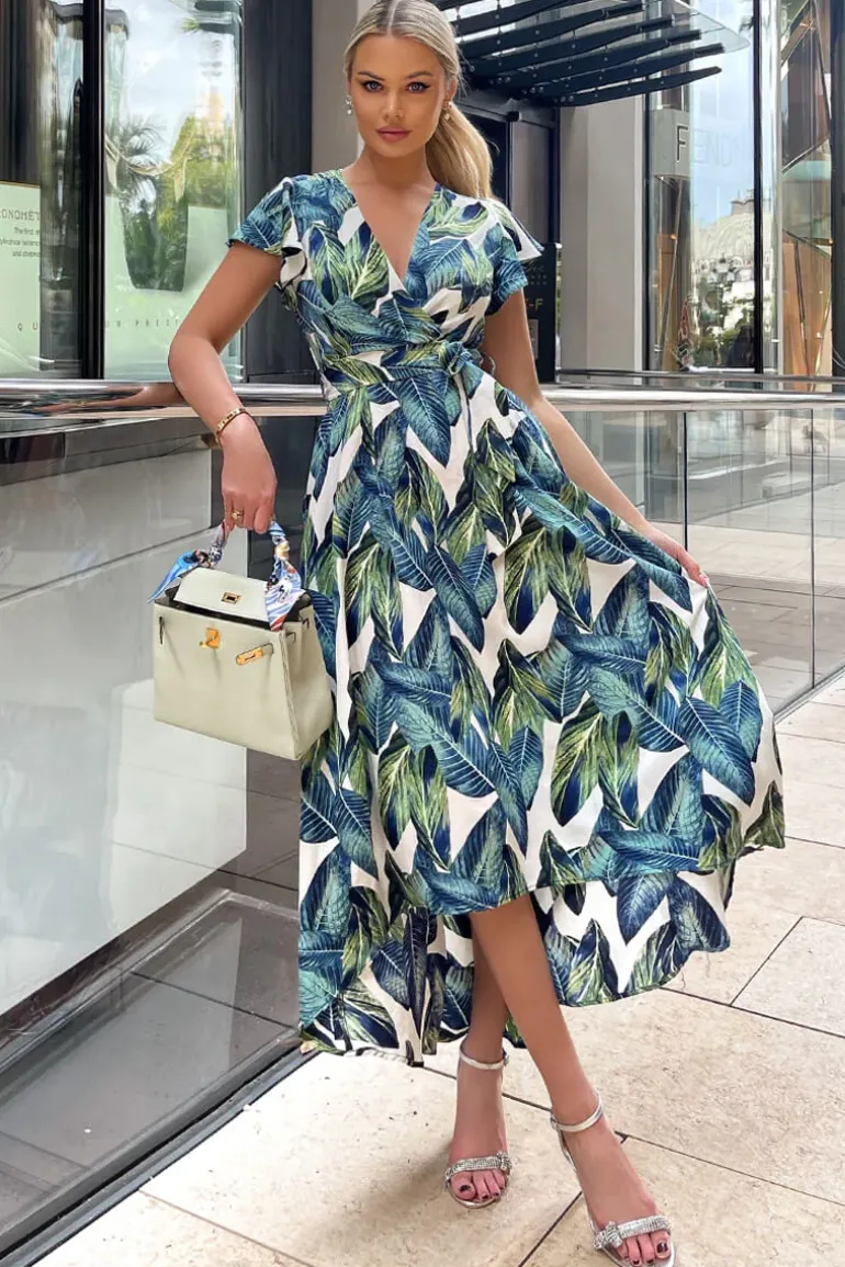 Stay sophisticated in this Blue Leaf Print Short Sleeve Belted Wrap