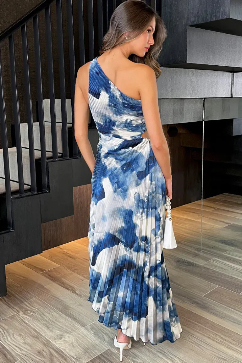 Our Blue Marble Print One Shoulder Cut Out Pleated Midi Dress is the