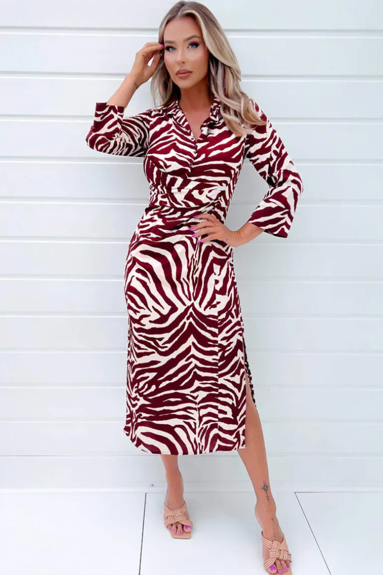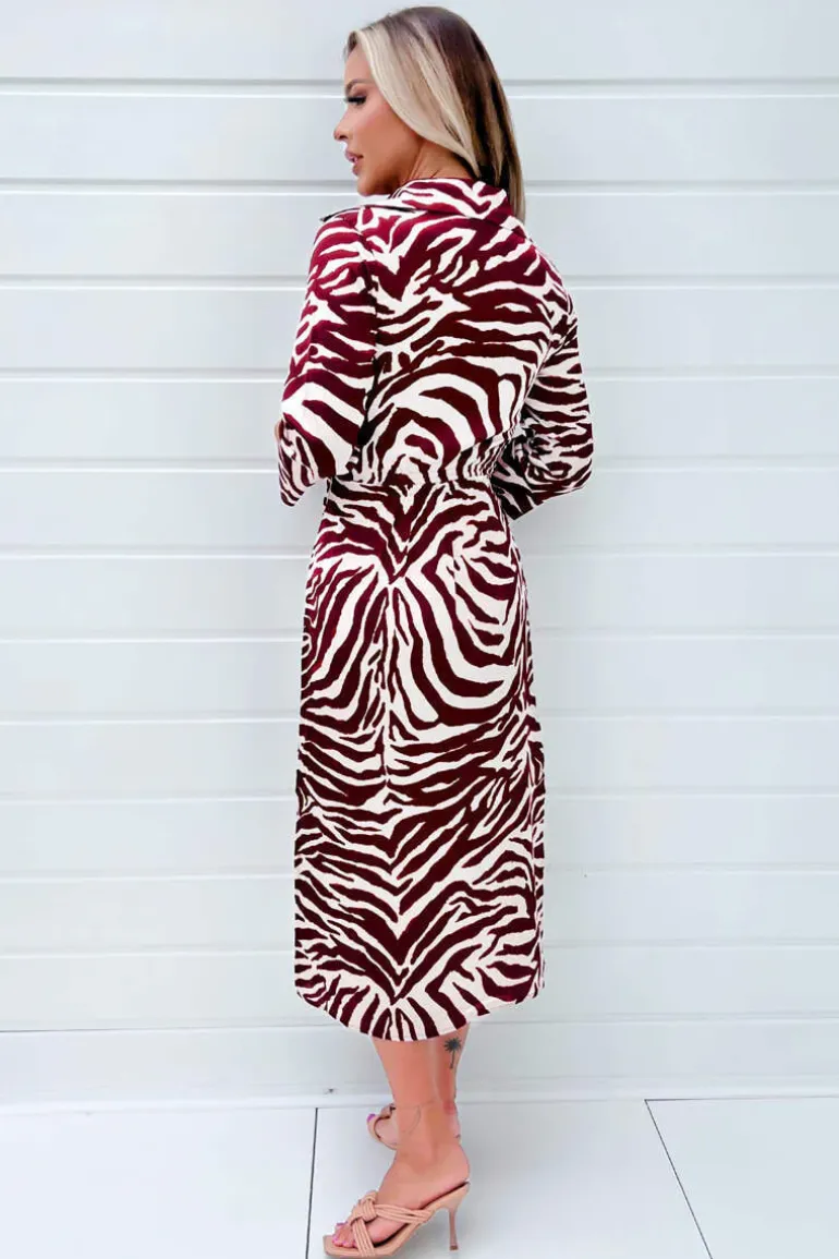 Why not grab our Burgundy Animal Print Button Top Gathered Side Midi