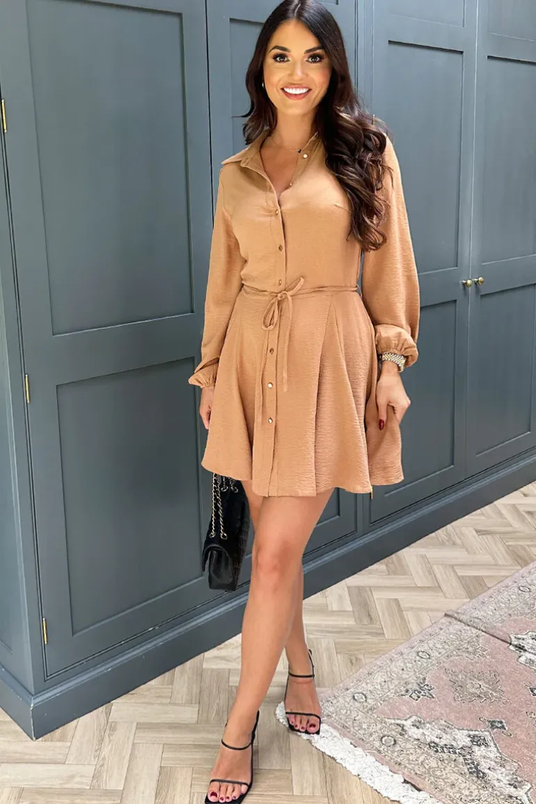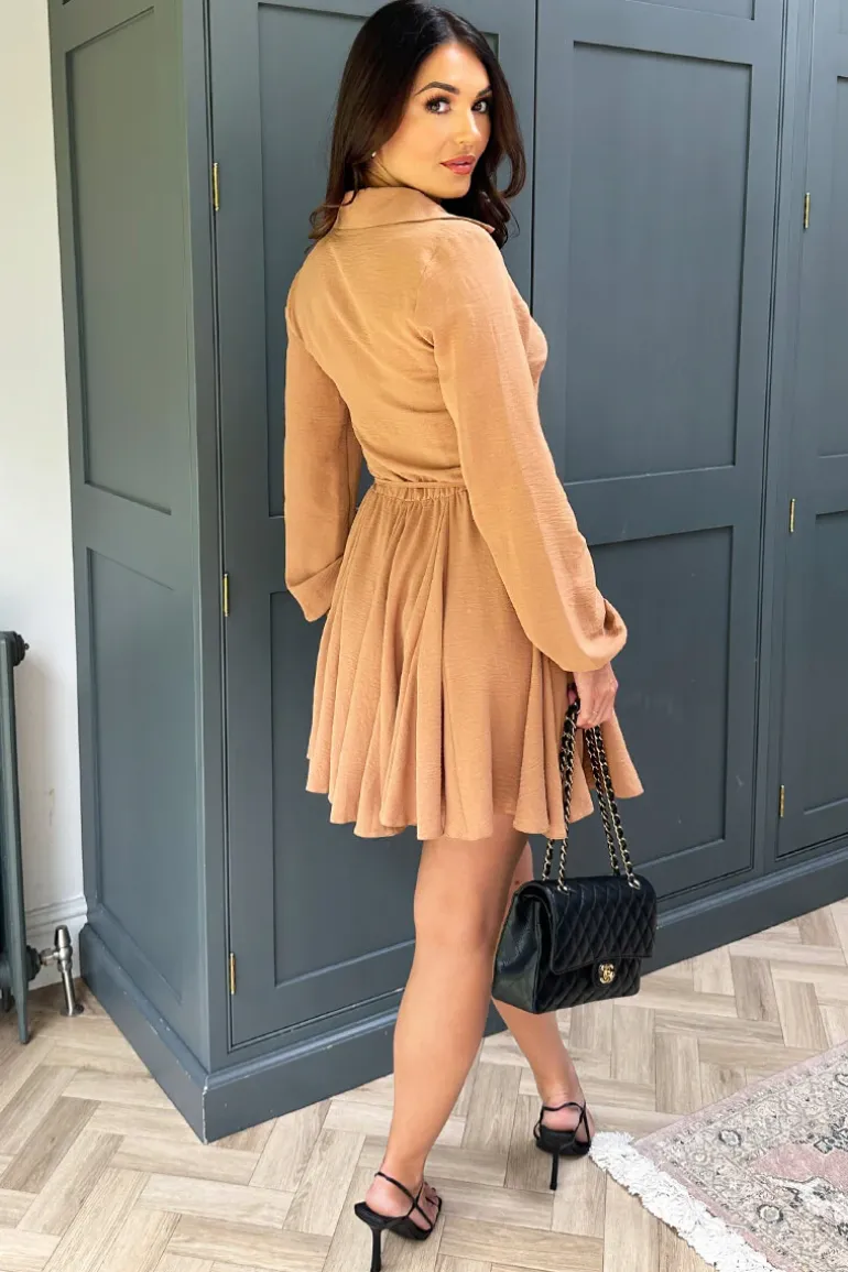 Keep it cute in this Camel Long Sleeve Button Front Skater Shirt