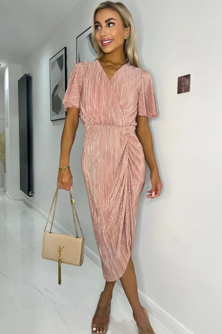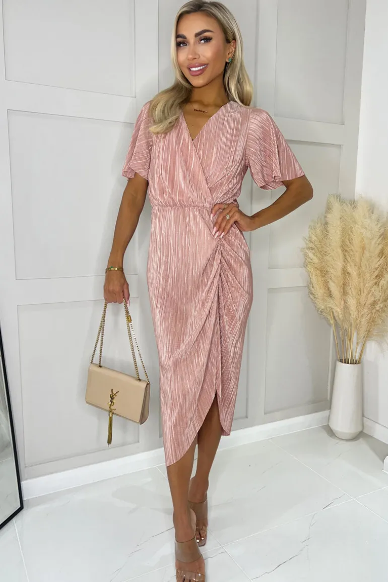 Our Champagne Wrap Top Short Sleeve Plisse Gathered Midi Dress is an