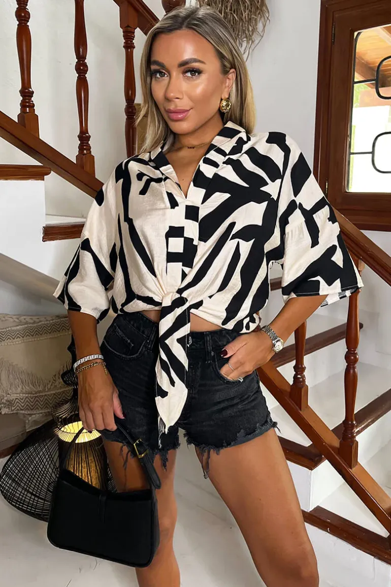 Our Cream And Black Abstract Print Button Front Tie Waist Top is a