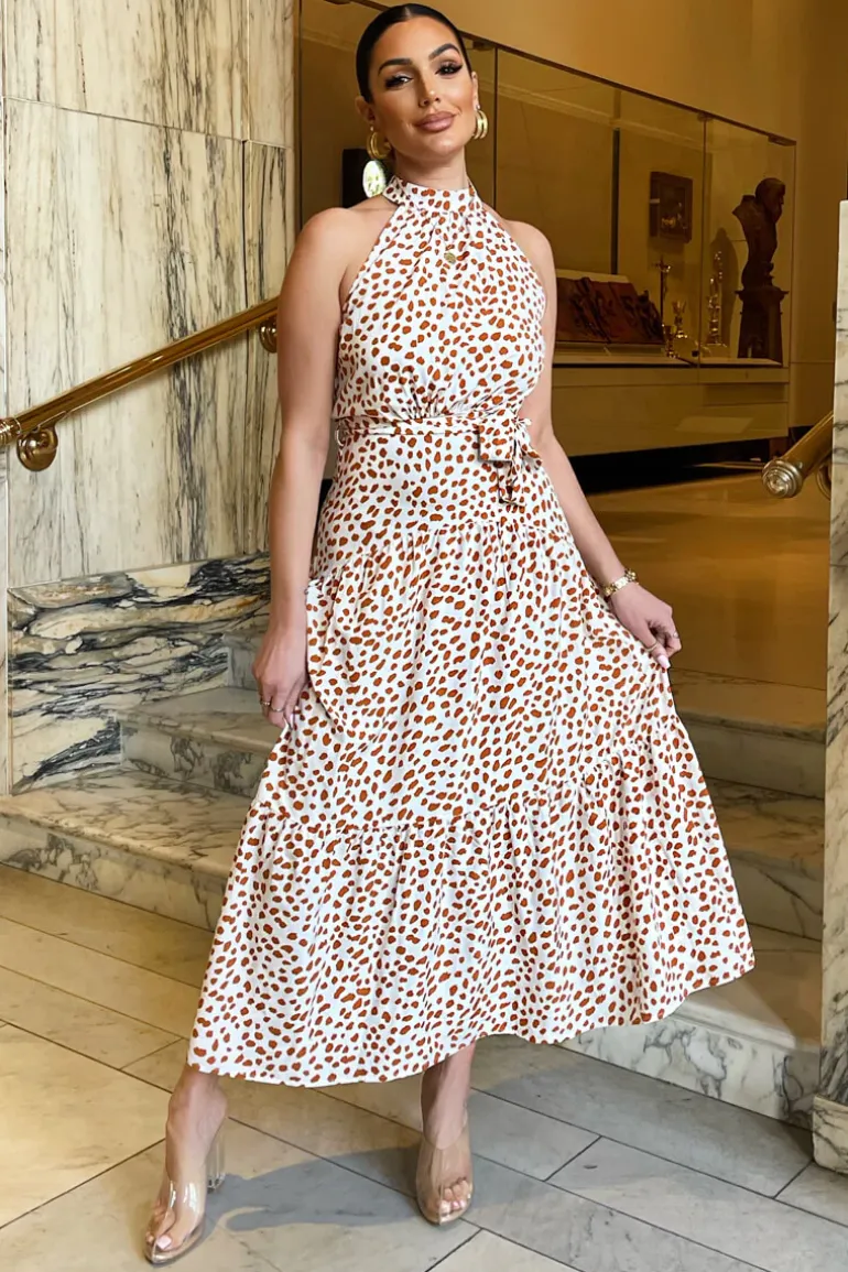 Look sophisticated in this Cream And Brown Print High Neck Tie Belt