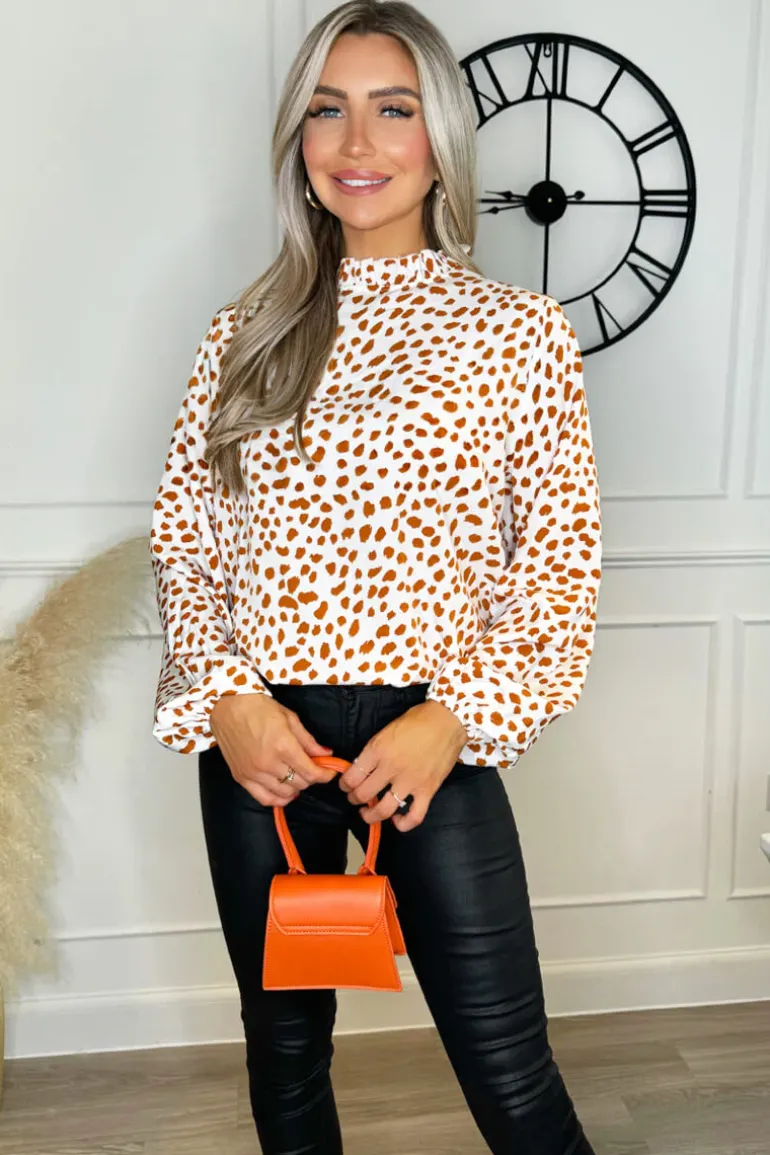 This flattering Cream And Brown Print Ruffle Neck Top is the perfect