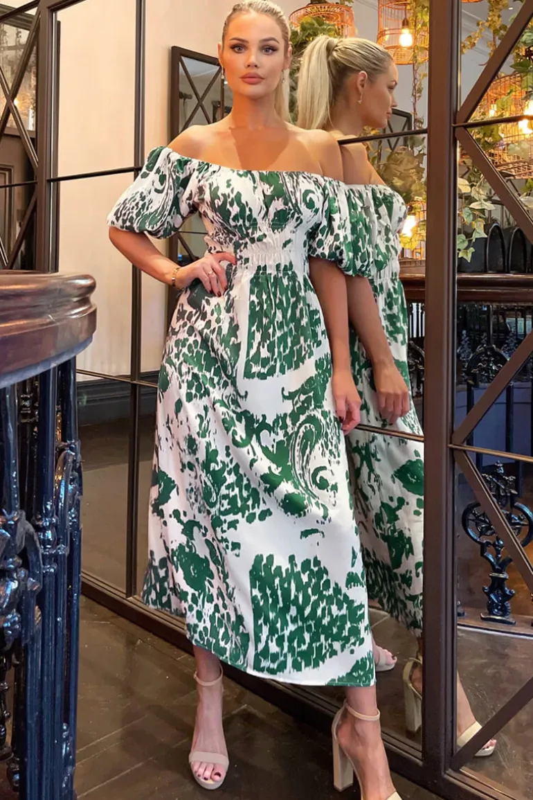 This Cream and Green Printed Elasticated Waist Bardot Midi Dress with