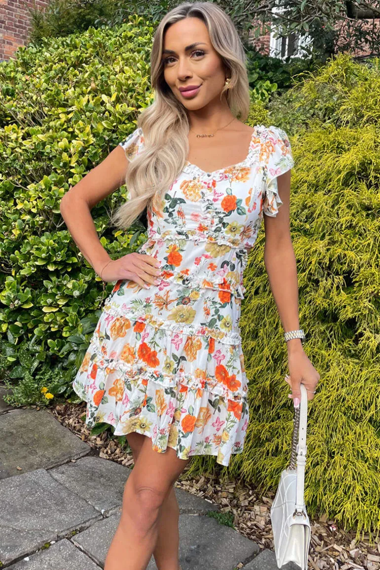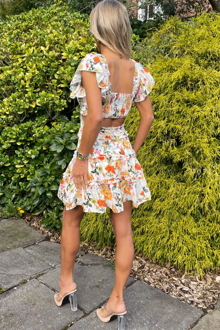 Our Cream Floral Printed Cut Out Back Frill Mini Skater Dress is the