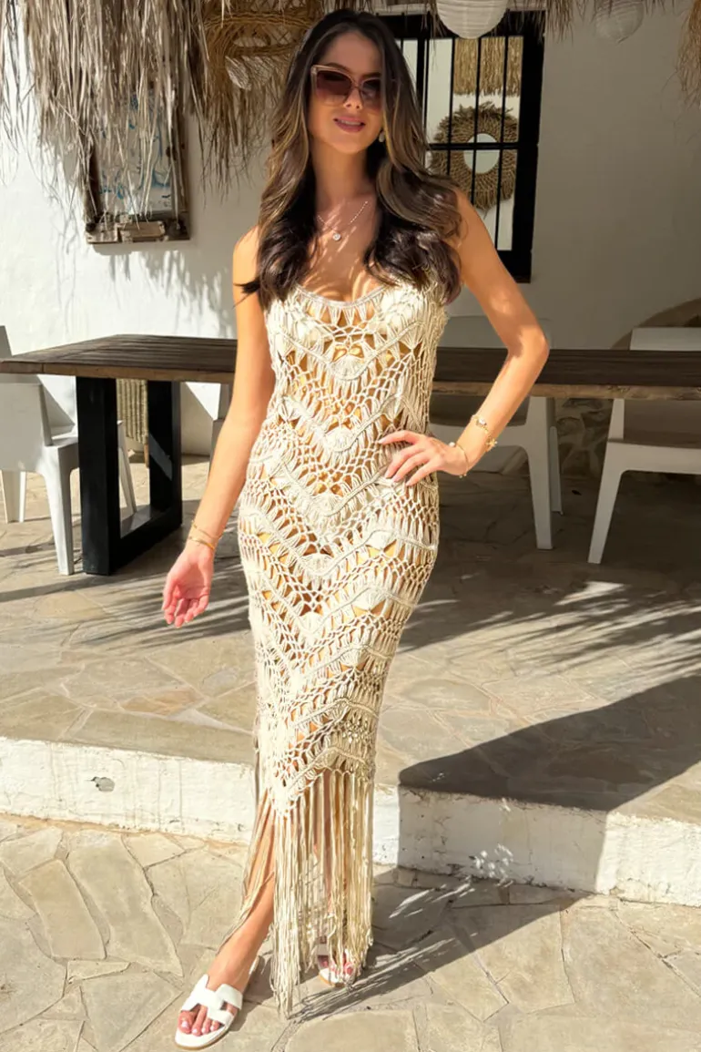 Be summer ready in our Cream Open Knit Crochet Fringe Hem Midi Dress.
