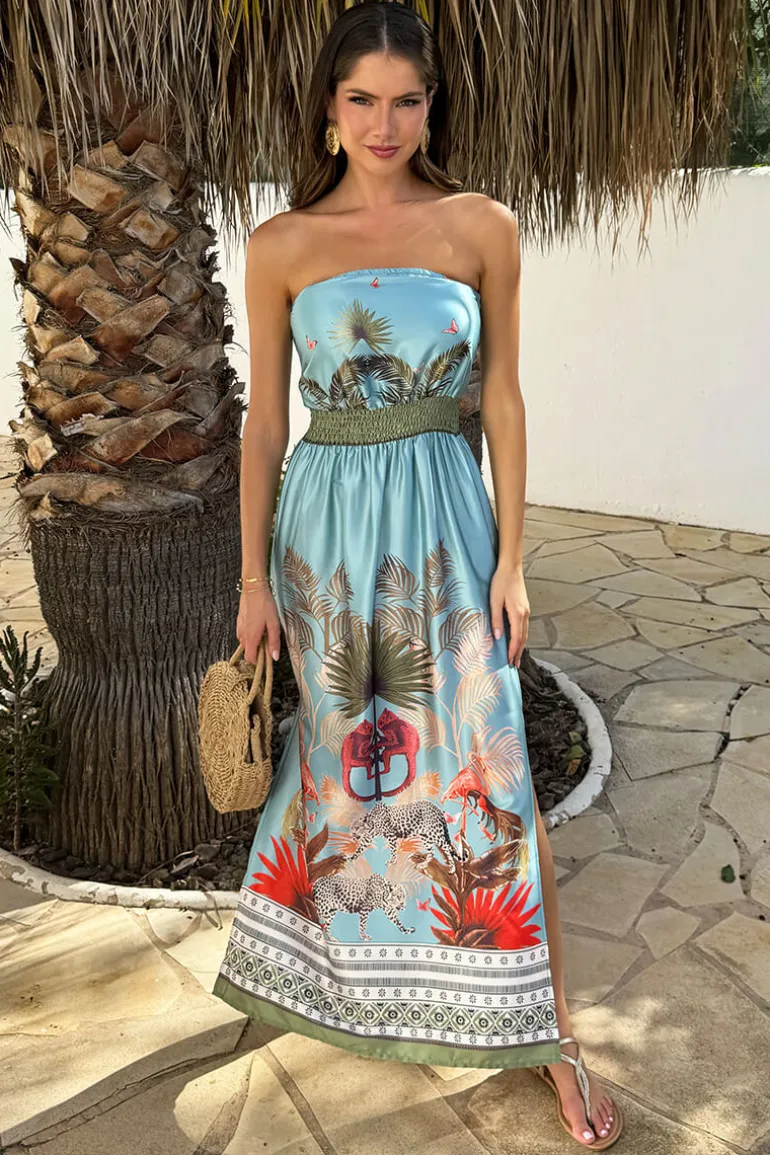 Step into the summer season with our Duck Egg Safari Print Strapless