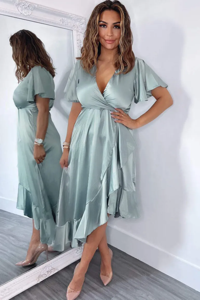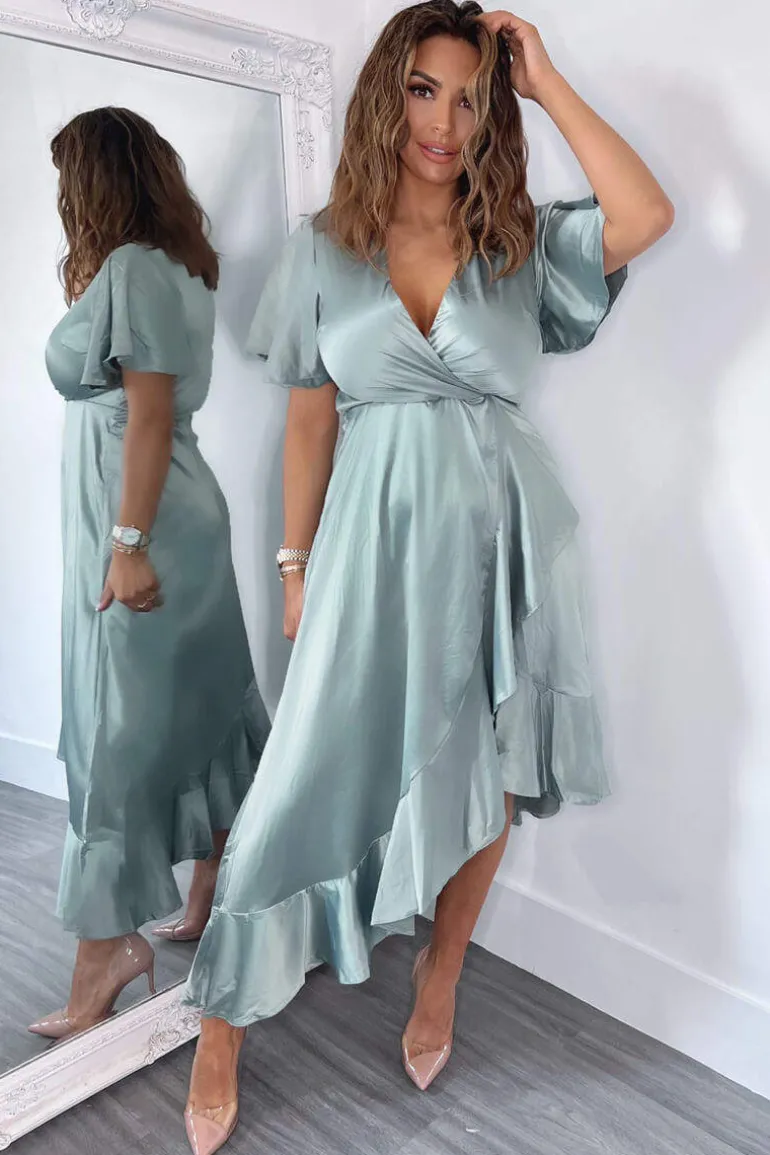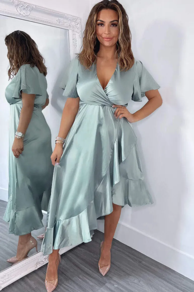 Our Duck Egg Satin Frill Hem Short Sleeve Midi Dress is the perfect