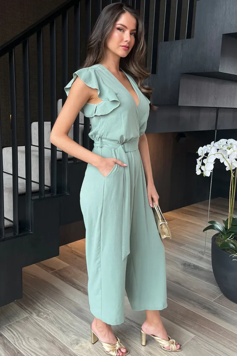 Look chic in our Duck Egg Wrap Top Flutter Sleeve Belted Jumpsuit.