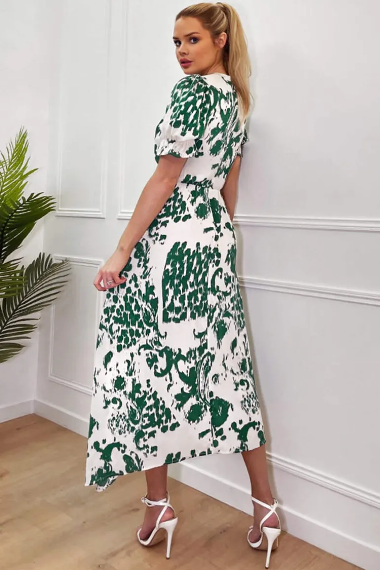 Our Green And Cream Printed Short Sleeve Wrap Over Midi Dress is an