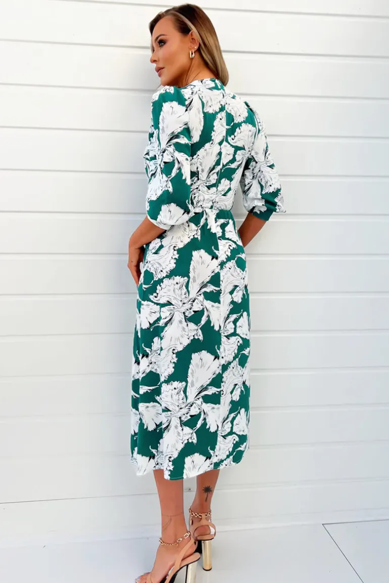 Our Green And White Floral Print Wrap Top Midi Dress is right on