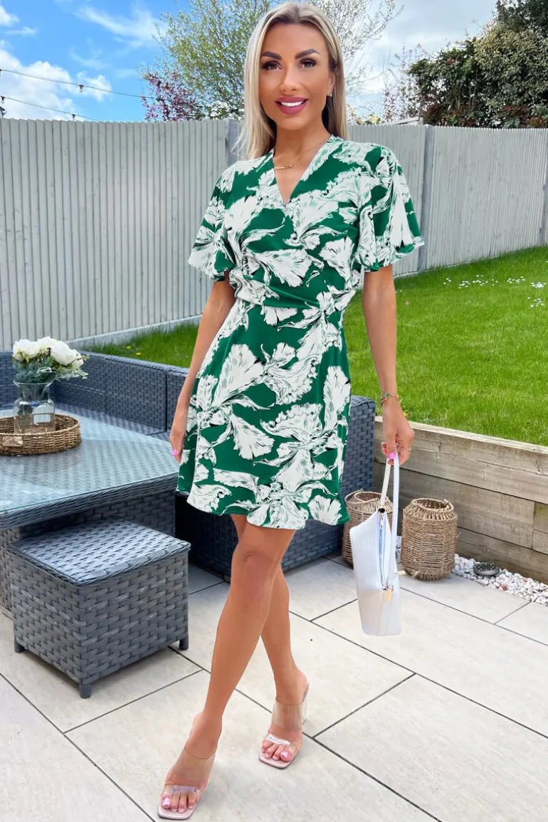 Printed Short Sleeve Day Dress. Featuring short frill sleeves, a wrap