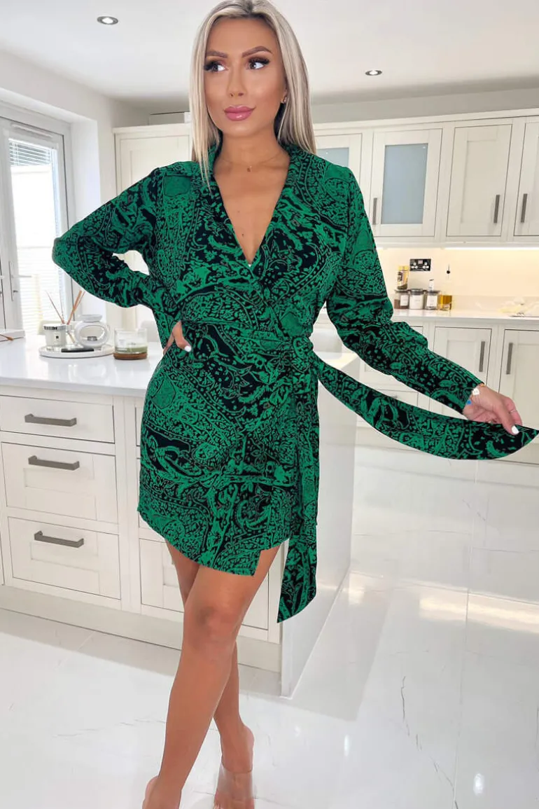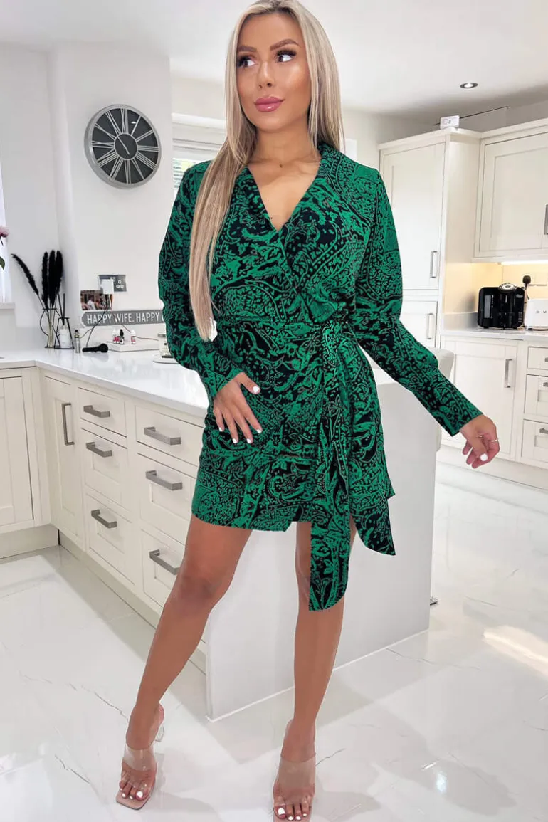 This Green Printed Tie Wrap Long Sleeve Mini Dress is perfect for a