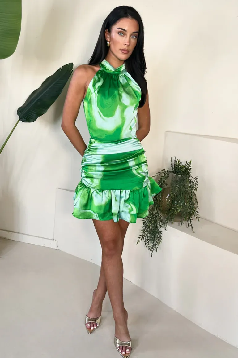 Our Green Tie Dye Print Halter Neck Ruched Mini Dress is right on