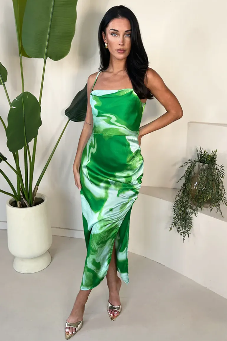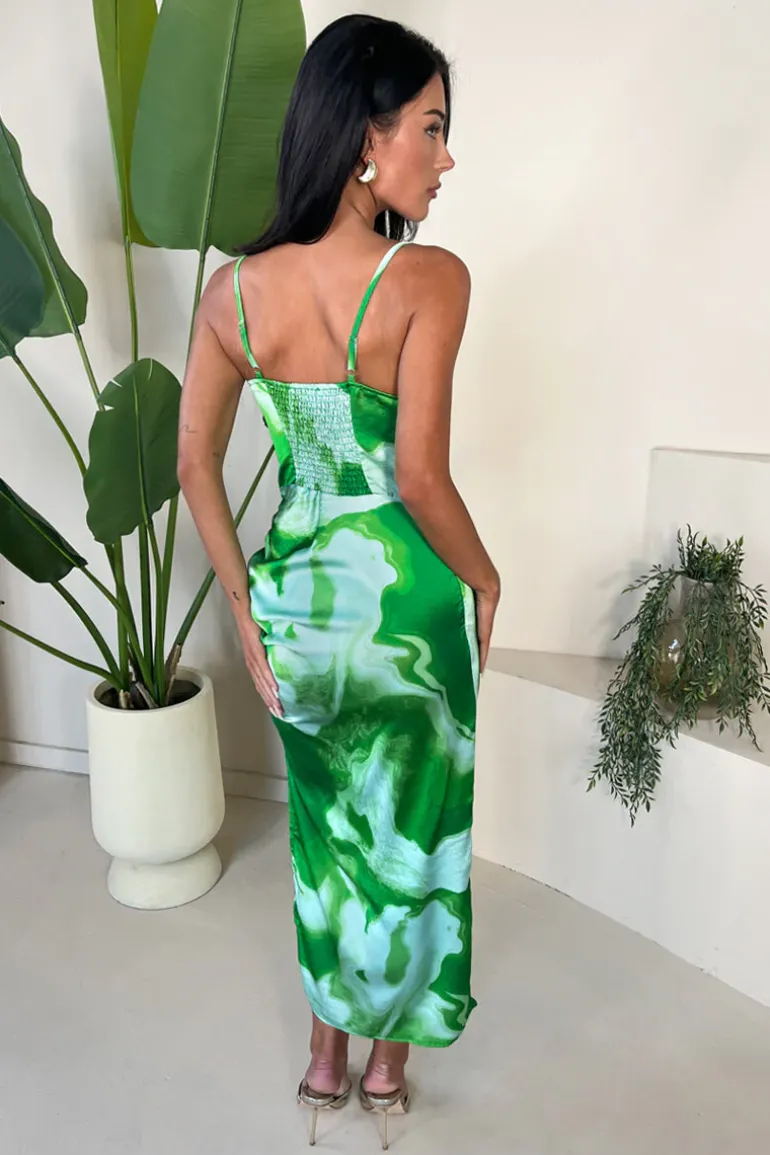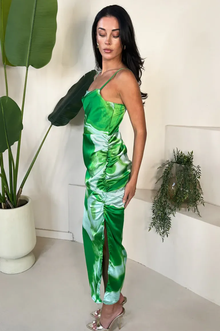 Embrace your glamorous side with our Green Tie Dye Print Ruched Side