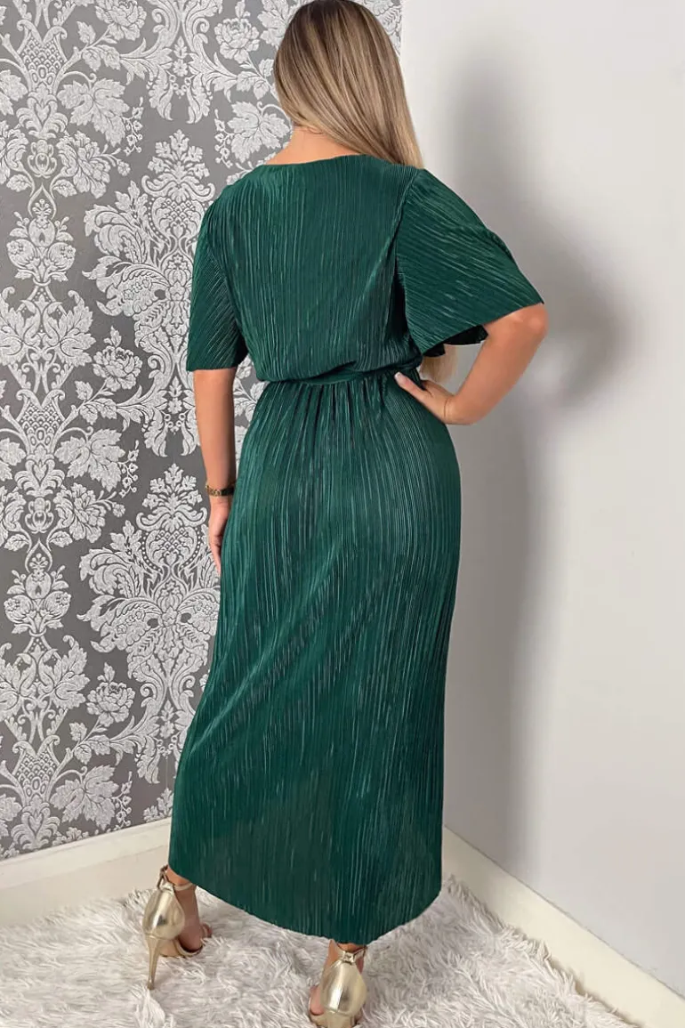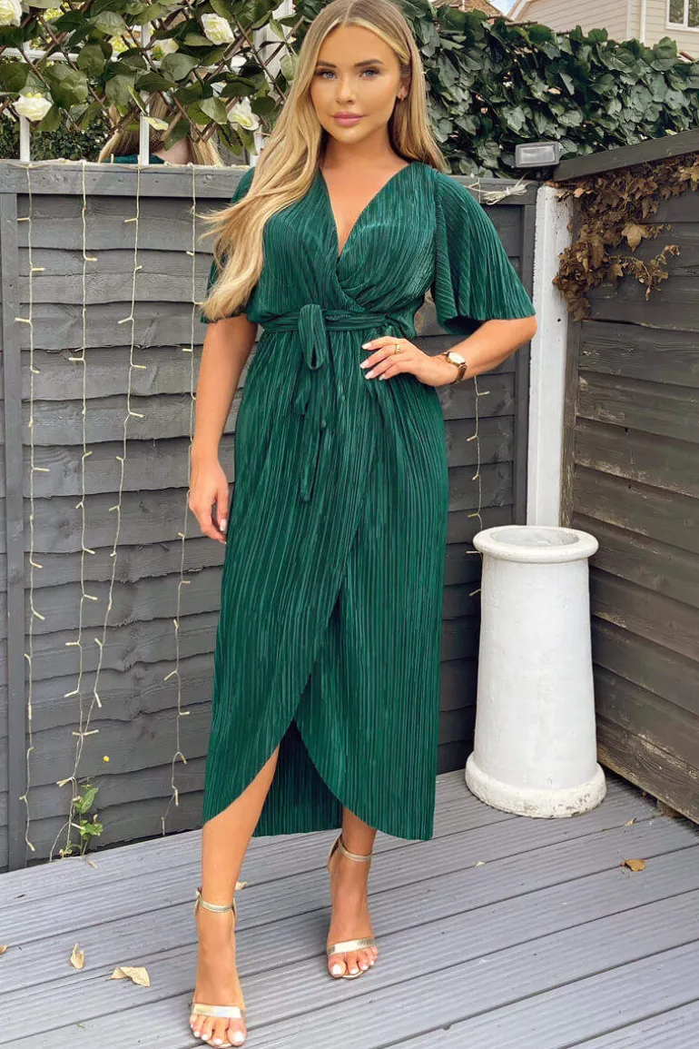 Our Green Wrap Top Belted Short Sleeve Plisse Midi Dress is an A/W