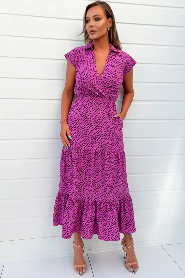 Stay on trend in our Hot Pink Heart Print Collared Smock Midi Dress.